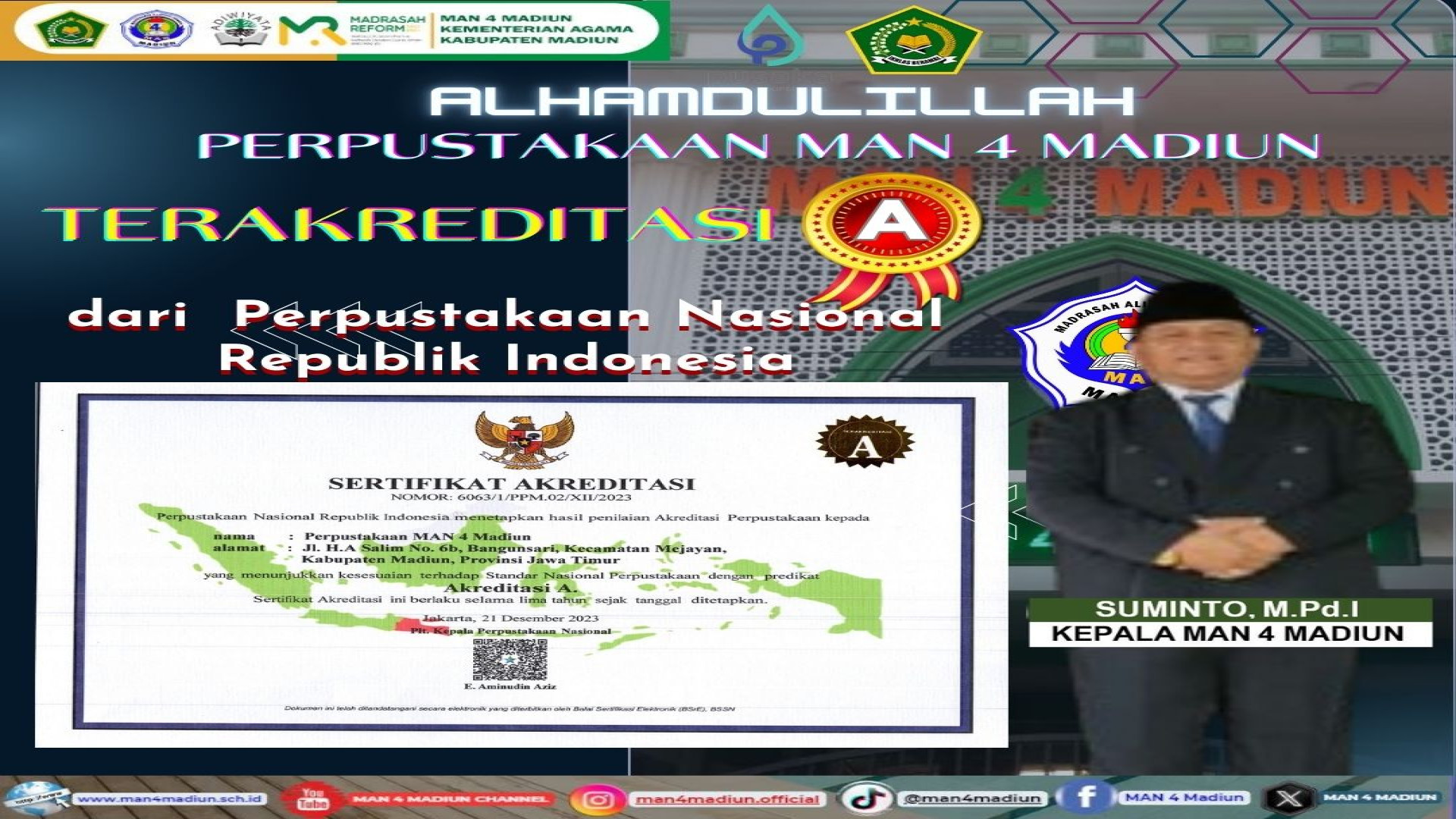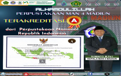 ALHAMDULILLAH AKHIR TAHUN 2023 PERPUSTAKAAN MAN 4 MADIUN MERAIH NILAI AKREDITASI A PERPUS DARI PERPUSTAKAAN NASIONAL REPUBLIK INDONESIA DAN BERLAKU UNTUK 5 TAHUN KEDEPAN. SEMOGA BAROKAH MANFAAT.