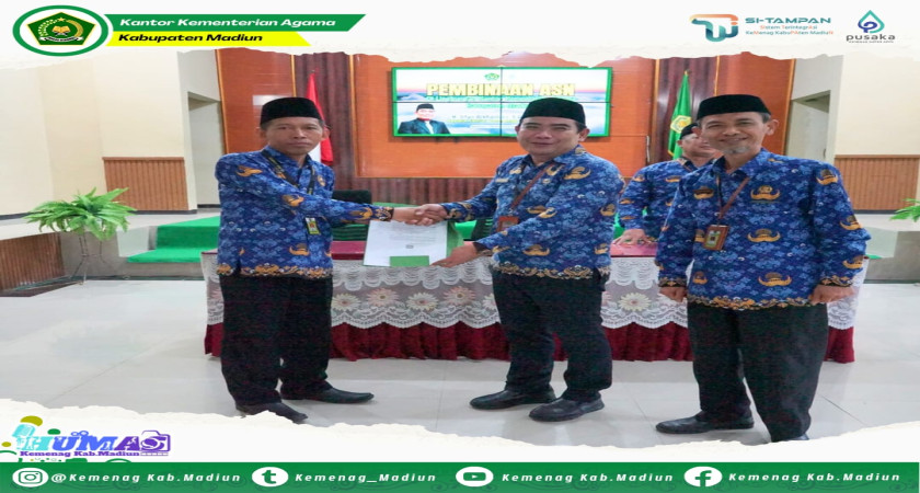 Madiun-Kota Caruban (MAN 4 Madiun) Kepala Kantor Kementerian Agama Kabupaten Madiun, H. Irfan Alkhaidari, S.Ag.,M.Pd.I menyerahkan Surat Keputusan (SK) Nomor 370 Tahun 2024 Tentang Penunjukan Pengurus Paguyuban Kehumasan Bidang Teknologi dan Personalia Wakil Kepala Bidang Hubungan Masyarakat (Waka Humas) Madrasah Kantor Kementerian Agama Kabupaten Madiun (18/11/2024) di Aula ‘Arofah Kankemenag setempat.